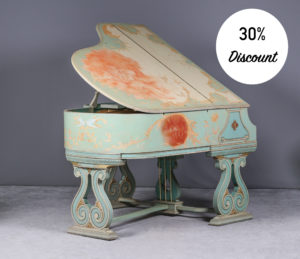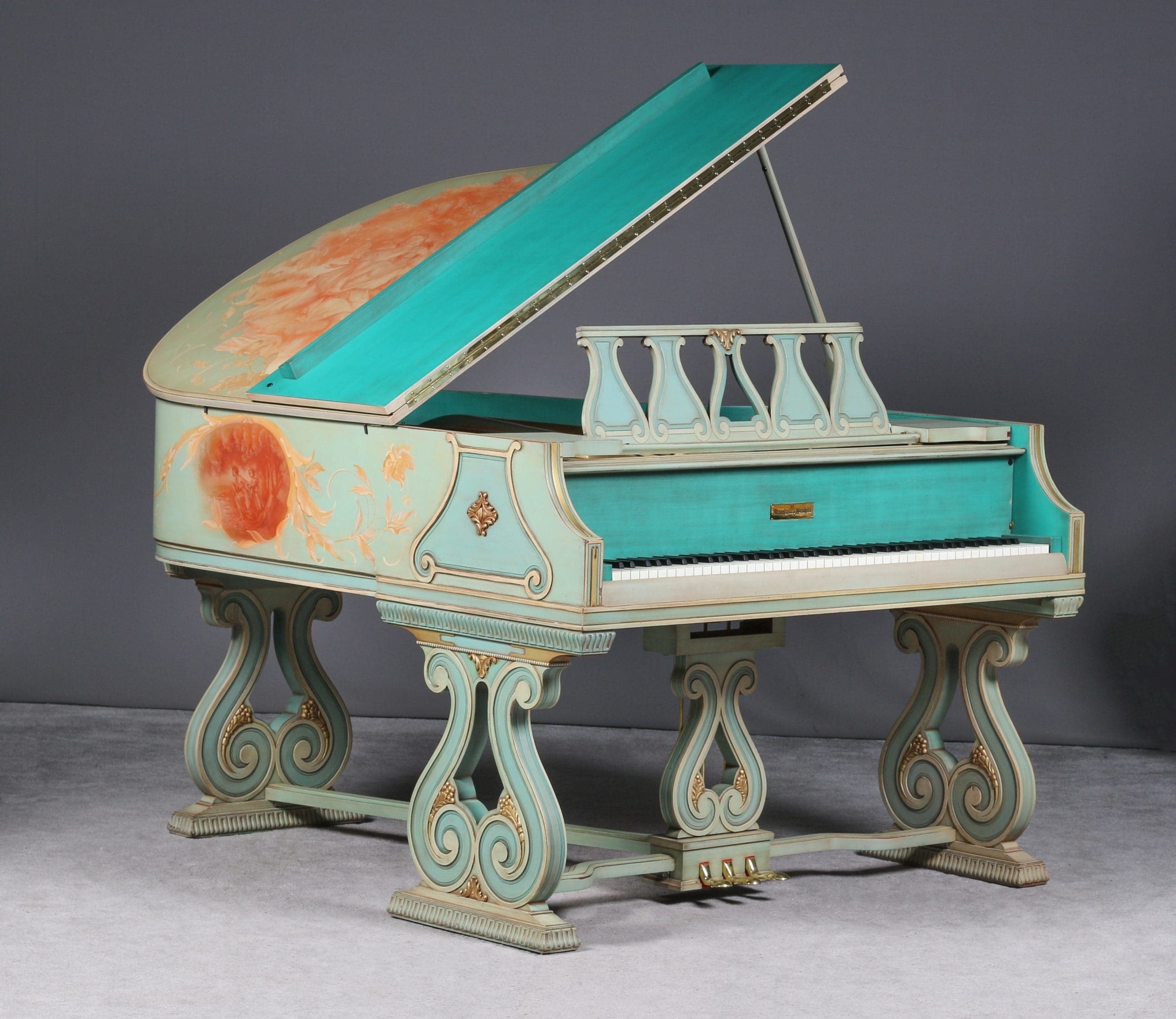The final piano we are highlighting today is this elegant custom designed Louis XVI Style Pleyel Grand Piano built in 1915. This piano was built in Paris a century ago and was custom made to resemble a Medieval-era harpsichord. Because of its massive “larger than life” proportions and unique styling, this piano was likely commissioned for some grand European castle or forgotten Baronial mansion. From what we know, the piano remained in France until the late 20th Century when it was exported to the United States. Sitting tall and proud on 7 individual Louis XVI style legs, the case is adorned with hand-painted murals accented in distressed greens and yellows and trimmed in aged antique gold. This piano was obviously created to appear “larger than life”; the exterior cabinet was made longer, taller and deeper than the instrument within. For more on this piano we’d love for you to view it HERE