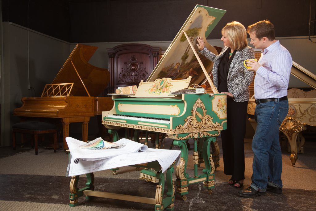 Most designers are not aware that THERE IS AN ALTERNATIVE to the mass-produced black baby grand piano for their clients. Period-style cases and custom faux finishes allow the Design Professional to offer an instrument to their clients that will blend in harmony with its surroundings.