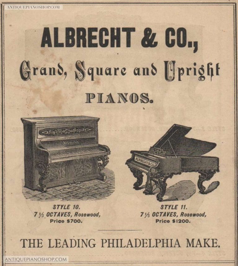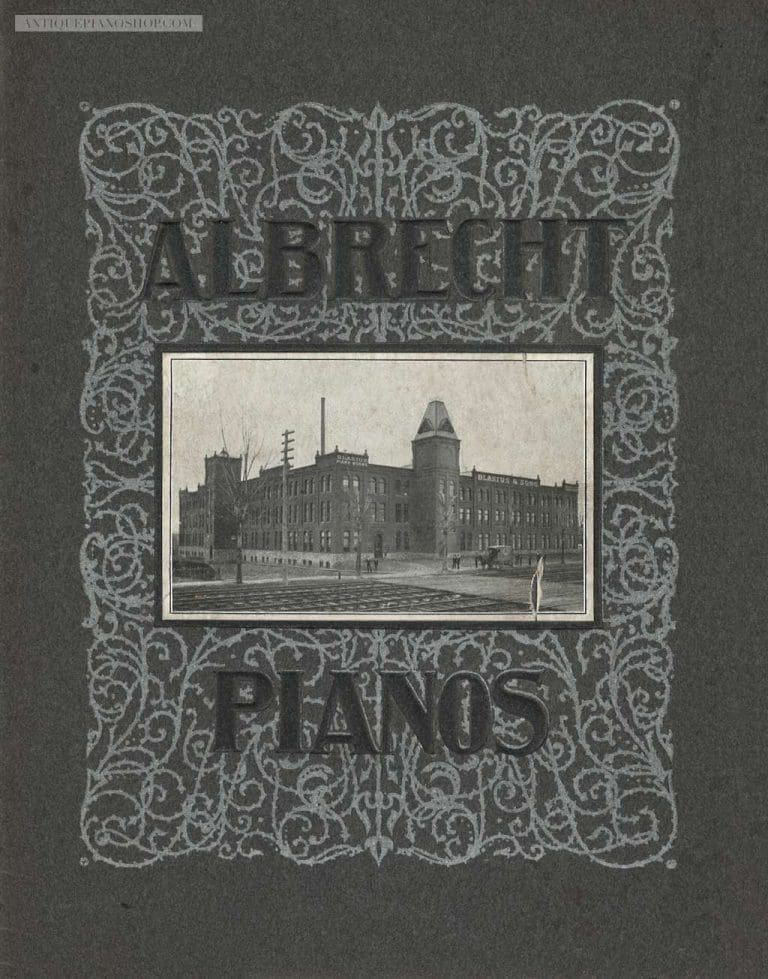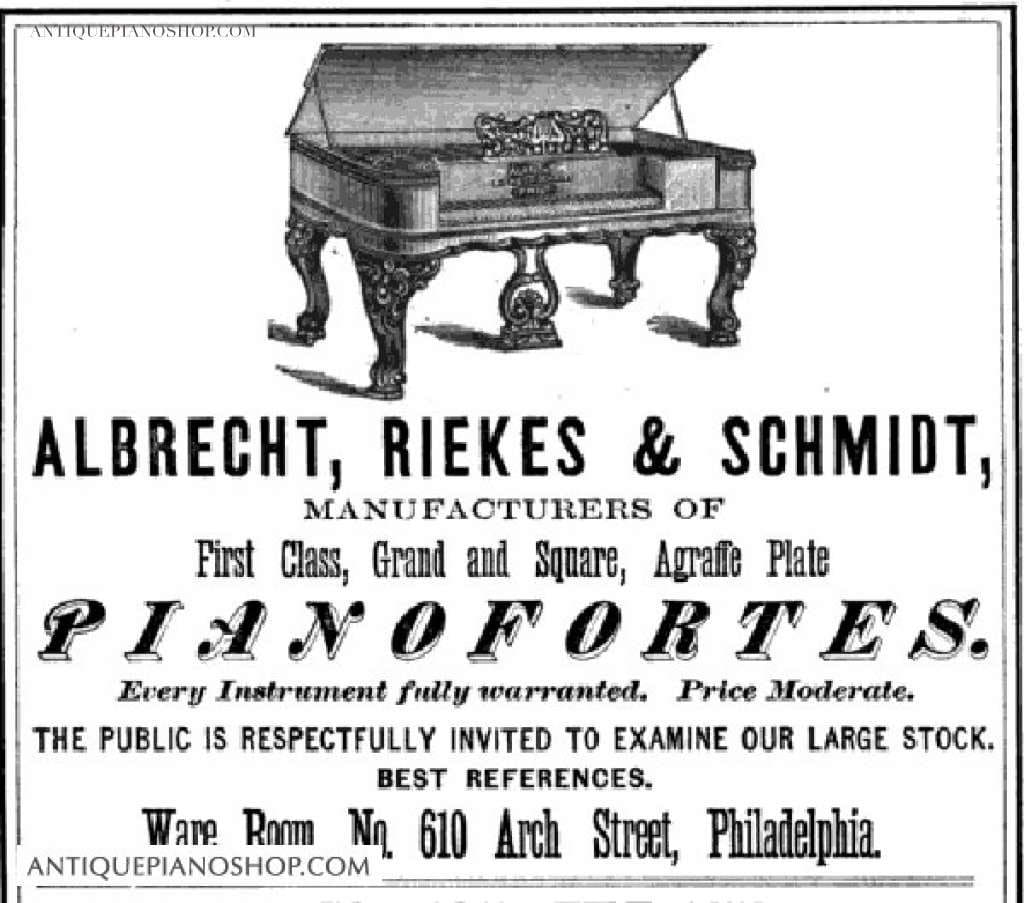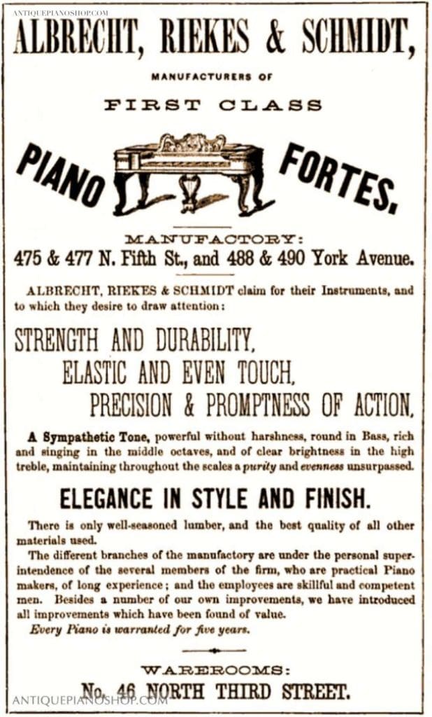 In about 1863, Christian F. L. Albrecht went into partnership with Frederick Riekes and Richard T. Schmidt to form the firm of “Albrecht, Riekes & Schmidt“. Albrecht, Riekes & Schmidt enjoyed much success, but Albrecht withdrew in 1874 to go back to building pianos under the name of “Albrecht & Company”. In 1887, The Blasius & Sons Piano Company purchased the Charles Albrecht Company, and Blasius continued to build the Albrecht name in upright and grand pianos well into the 20th Century. They were very expensive, high grade pianos, and they were built in modest numbers.
