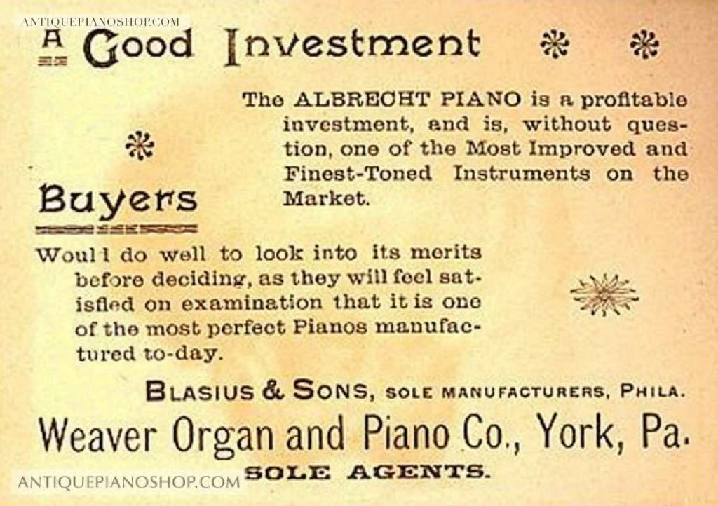 Like Blasius, Albrecht pianos of the late 19th and 20th Centuries were of superior quality and were very heavy, durable instruments. Blasius and Albrecht names were discontinued sometime in the middle of the 20th Century, but the rights to the names were purchased in the 1990’s and are again being produced in new pianos.