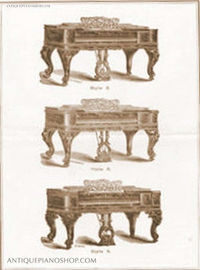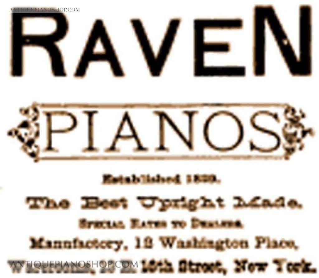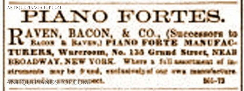 RAVEN, BACON & COMPANY: After the death of George Bacon in 1855, his son Francis Bacon joined the firm and the name of the firm was changed to Raven, Bacon & Company. In 1862 the name of the firm was again changed to simply “Raven & Bacon”. In about 1872, Richard M. Raven died and the firm was taken over by Thomas Raven. The firm continued to operate as “Raven Piano Works until just before 1890.
