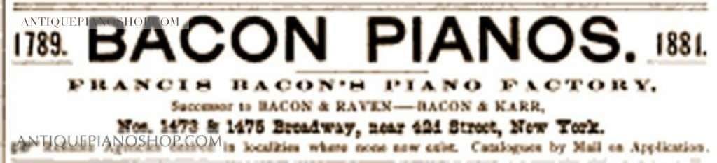 BACON & KARR: Francis Bacon withdrew from the firm of “Raven & Bacon” in 1872 upon the death of Richard M. Raven. Bacon then joined William H. Karr in partnership as “Bacon & Karr”. William H. Karr was a successful music dealer who provided the financial backing for Francis Bacon to continue building his instruments. These instruments were sold under the “Bacon & Karr” brand name. The partnership of “Bacon & Karr” was dissolved in 1879.