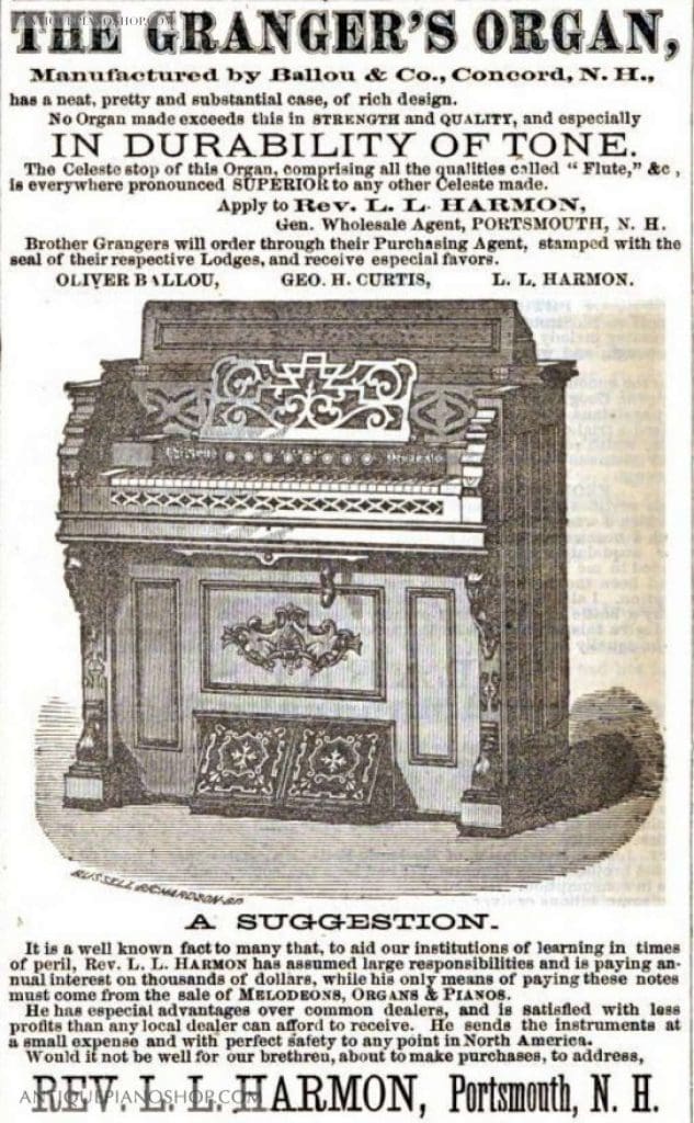 The Ballou Organ Company was a small firm located in Concord, New Hampshire during the late 19th Century. It was established by partners Oliver Ballou, George H. Curtis, and Rev. L. L. Harmon in about 1870. The company built organs under the names of Ballou and Ballou & Curtis. What little information we have about the firm indicates that they built very good quality home and chapel organs which were distributed mainly across the northeastern United States.