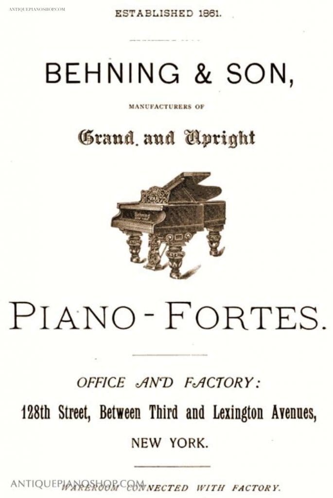 The Behning Piano Company was established by Henry Behning in 1861 in New York. The first factory was located at 57 East 128th Street, with factories expanding to East 133rd Street in the 1920’s. From about 1864 – 1873, Behning was in partnership with Mr. Albrecht Klix, building pianos under the name of “Behning & Klix”. Mr. Behning continued building pianos under his own name after the partnership with Klix came to an end.