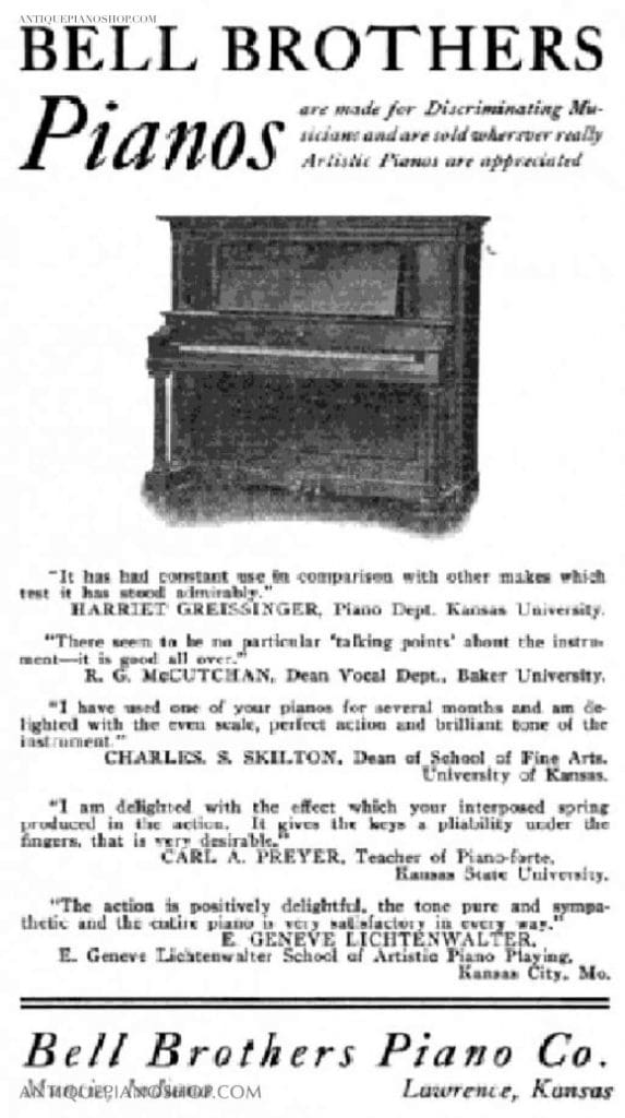 The Bell Brothers Piano Company was established around 1915 in Muncie, Indiana. The firm was known for building very good quality pianos, and they were widely distributed throughout the Midwestern United States. In addition to the Bell Brothers name, the firm built pianos under the Deterling and Merriman brand names. Deterling and Merriman were sold as affordable alternatives to the costlier Bell Brothers brand, while offering comparable quality. The Bell Brothers Piano Company was out of business before 1930 due to the Great Depression.