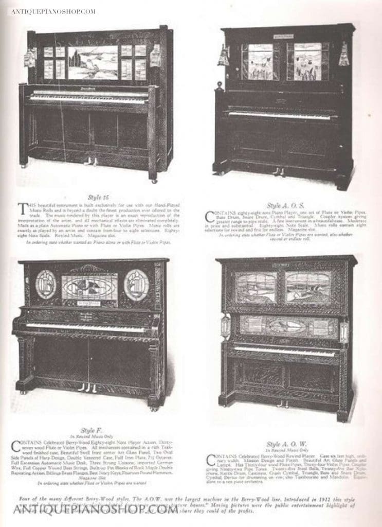 The Berry-Wood Piano Player Company was established in Kansas City, Missouri, in about 1907. They were an early entry into the coin piano field, and they built very rugged, handsome and durable instruments. There is no indication that Berry-Wood ever built conventional pianos; only coin operated player pianos and orchestrions. Sadly, Berry-Wood was out of business before 1920, so they never were able to take full advantage of the 1920’s height of coin piano popularity. Berry-Wood instruments are exceedingly rare today.