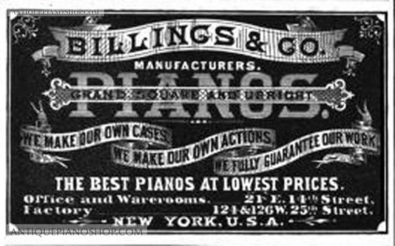 Andrew Billings began building organs in about 1874 in New York City. In about 1876, he started building pianos in addition to his organ line. Billings & Company was established about 1880, and the firm was known for building higher quality pianos as well as piano parts & supplies.