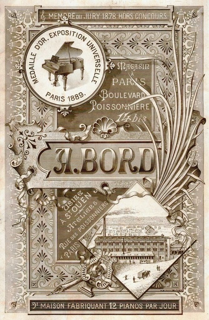 Antonie Bord was one of France’s most popular piano manufacturers, building pianos by the thousands annually. Bord was established in Paris in 1840, and enjoyed huge success for over a century. Bord instruments are very popular today in Europe, but they are somewhat scarce here in America. In 1934, Bord was purchased by the illustrious Pleyel Piano Company of Paris. The A. Bord brand name was discontinued around 1960.