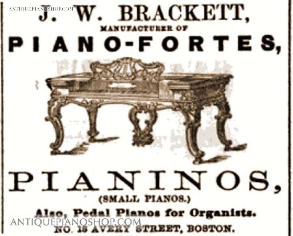 The J.W. Brackett Piano Company was established by John W. Brackett in 1857. Their factory and showrooms were located at 581 Washington Street, Boston. J.W. Bracket built a number of unusual “pedal board” pianos, which were upright pianos that incorporated an organ-type pedal board that would aide in organ practice. Brackett was a small firm, and his instruments were of very high quality. They are very scarce today. Apparently J.W. Brackett was out of business before 1890.