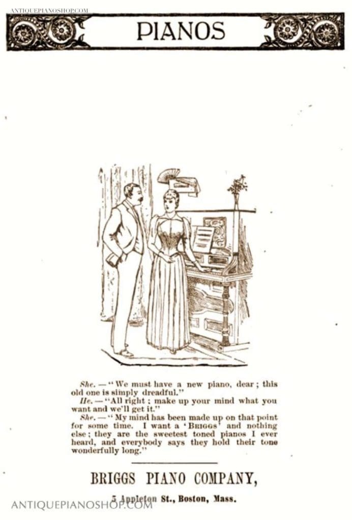 By the last part of the 19th Century his son, C. C. Briggs, Jr., was admitted into the company and is listed as president of the firm around the turn-of-the-century era. After 1912, Briggs was controlled by the National Piano Manufacturing Company, and they were also affiliated with The Hallet & Davis Piano Company, The Jacob Doll Piano Company, and The Premier Piano Company in the last decade of production. There is no mention of Briggs after the onset of the Great Depression era.
