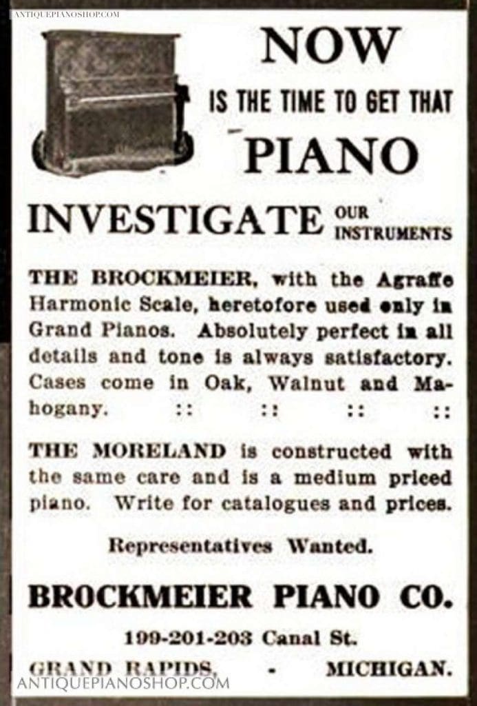 The Brockmeier Piano Company was established in Grand Rapids, Michigan in 1908. Their factory was located at 199-203 Canal Street. The Brockmeier Piano Company offered a line of upright pianos, player pianos, and baby grand pianos during the first quarter of the 20th Century. The firm was known for building good quality, durable instruments.