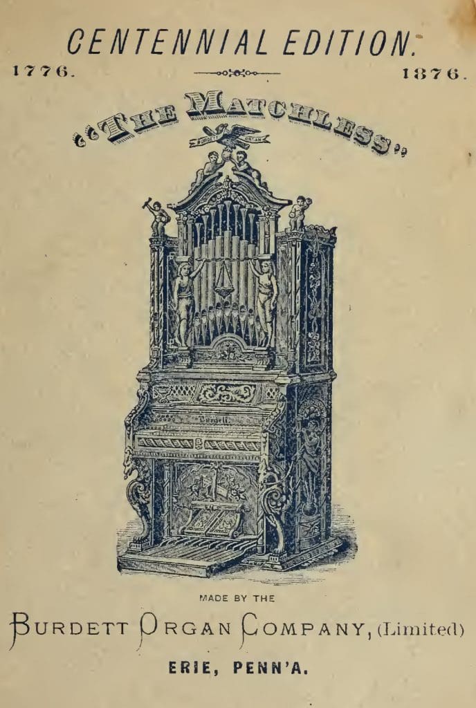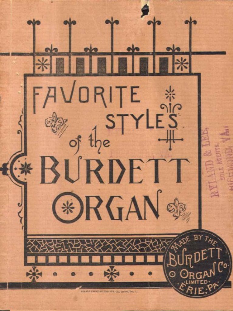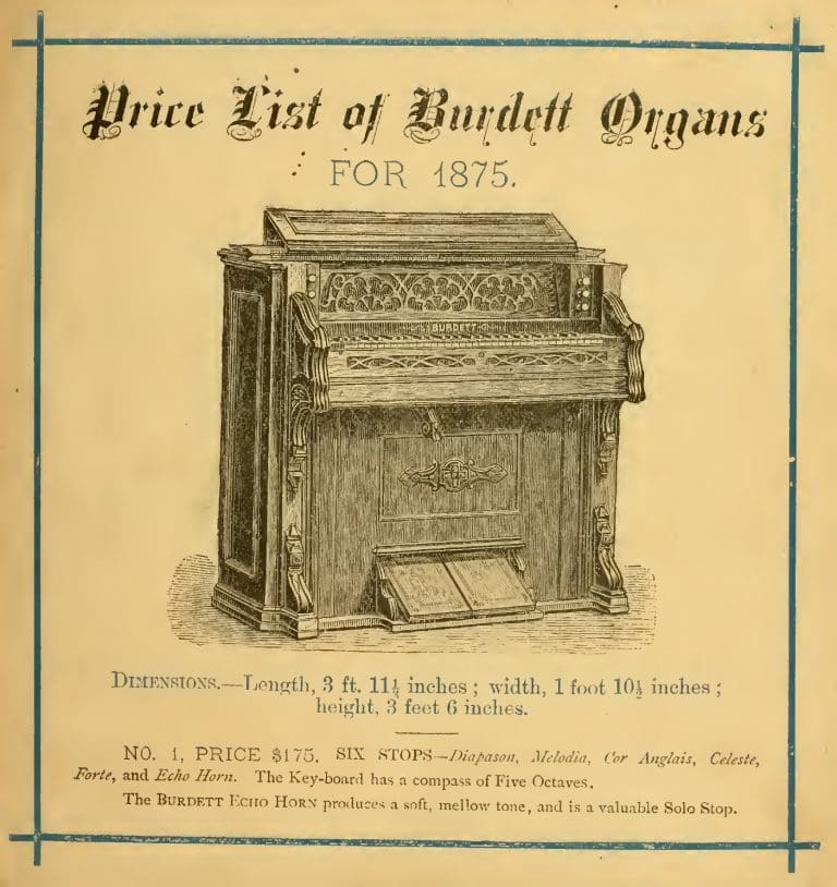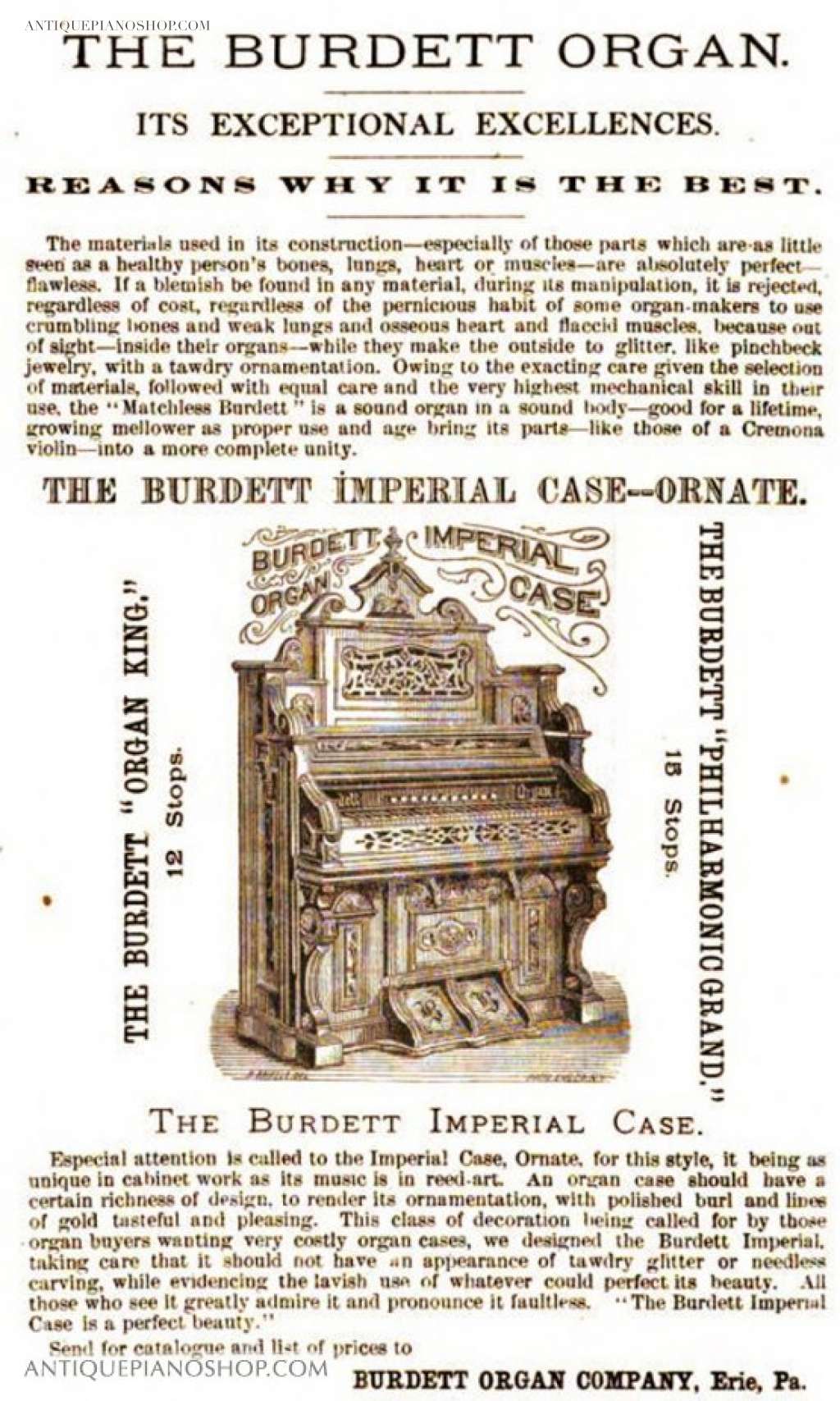 The Burdett Organ Company was originally established as R. Burdett & Company in about 1866 after Burdett left partnership with the large and prominent Estey firm. Burdett built organs in Chicago with much success until the Great Chicago Fire of 1871 destroyed their factory. Burdett was forced to leave Chicago after the fire, so he relocated his firm to Erie, PA and opened as The Burdett Organ Company. Burdett rebuilt his business in PA, and was known for building very good quality, elaborate instruments. The Burdett Organ Company closed in 1885 when Burdett retired and moved back to Chicago. The rights to the Burdett name were purchased by the Edna Organ Company of Monroeville, Ohio after Burdett’s retirement.