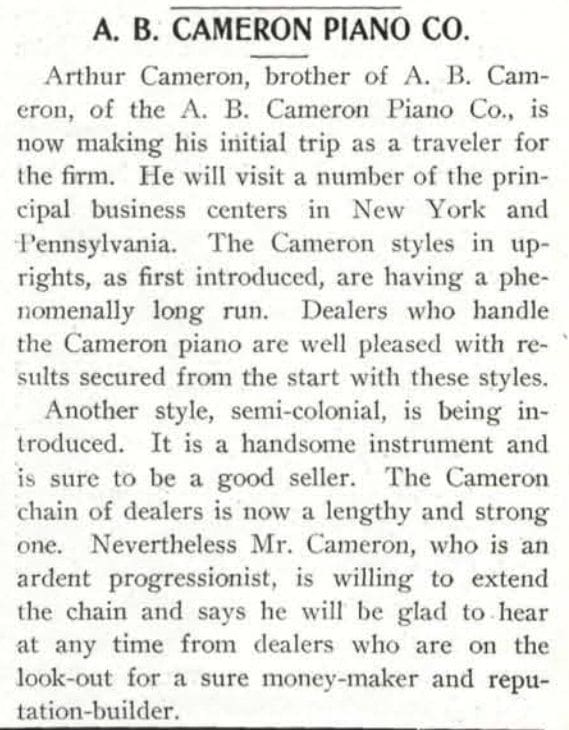 In addition to having his own firm, A. B. Cameron was listed as President of “The Knickerbocker Piano Company” of New York in 1912. Knickerbocker went out of business a short time later while Cameron’s firm continued to prosper. As A. B. Cameron’s success grew, the firm moved to larger quarters. First, the firm was relocated at 502 – 506 East 74th Street, then finally to 213 East 135th Street, New York City.