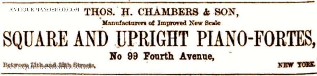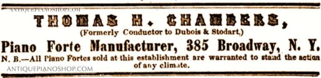 Thomas H. Chambers was one of the more active piano makers of the early 19th Century. Chambers is listed as making pianos as early as 1835 and his first workshop is listed at 31 Crosby Street, New York City. In addition to building pianos, Chambers was a music publisher/dealer in his early years.