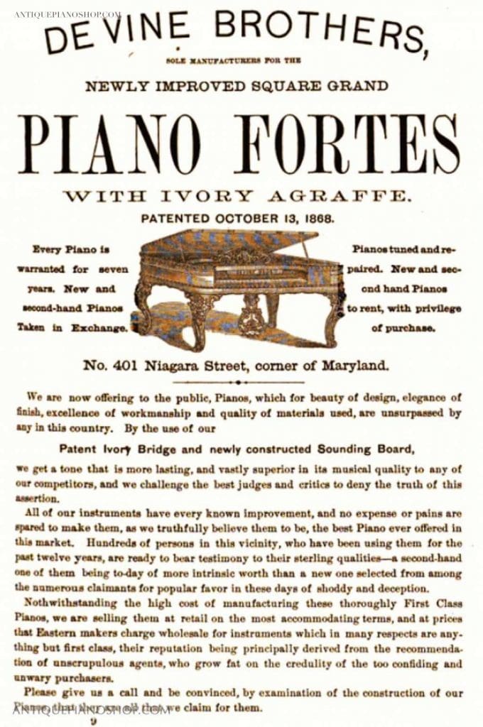 Late 19th Century Advertisement For The DeVine Brothers Piano Company, Circa 1870