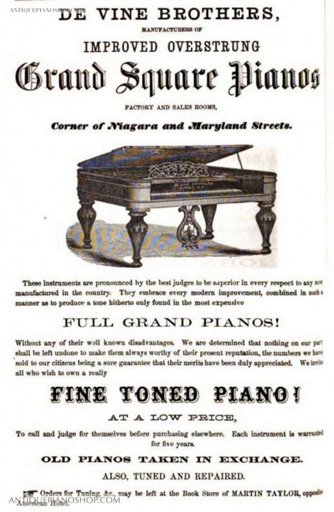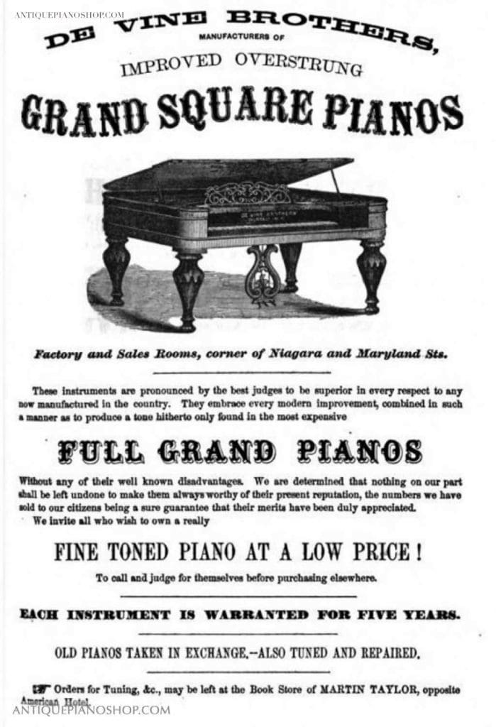 The DeVine Brothers Piano Company was established around 1862 in Buffalo, New York. The firm built several models of square grand pianos during the mid to late 19th Century, and their factory was located at the corner of Niagara & Maryland Streets. DeVine Brothers was a very small firm, and they never produced a large volume of pianos. They had a reputation for building very good quality, high grade square pianos during their short history. There is no mention of DeVine Brothers after about 1880, indicating the firm only lasted about two decades. Pianos by DeVine Brothers are exceedingly rare today.