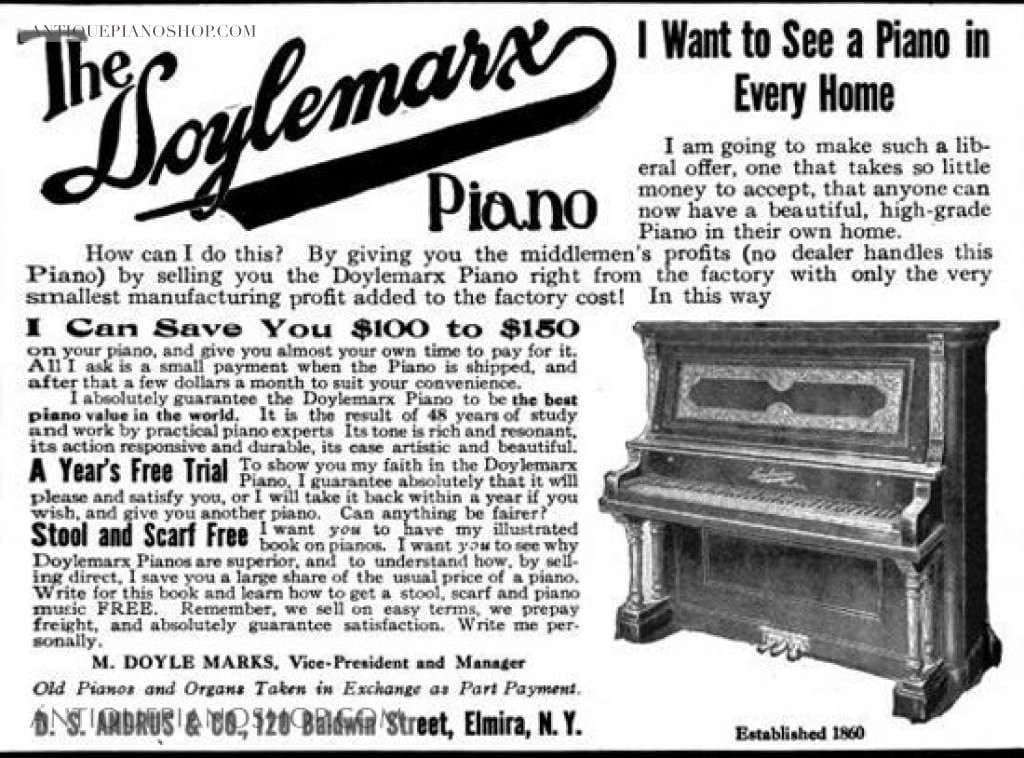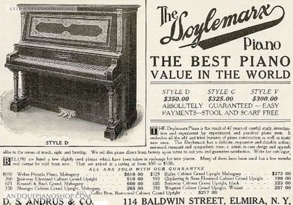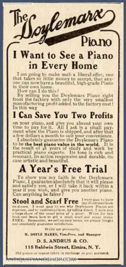 In 1904, Mr. Doyle Marks introduced a line of pianos built to his own specifications and designed to meet the need for a quality instrument at a low cost. With it came the trade name “Doylemarx“. The pianos, both uprights and grands, were manufactured in New York City, under the supervision of Julius Winter, and were distributed from Elmira throughout the country. In 1914, the firm’s name was officially changed from “D. S. Andrus & Company” to “M. Doyle Marks Company”.
