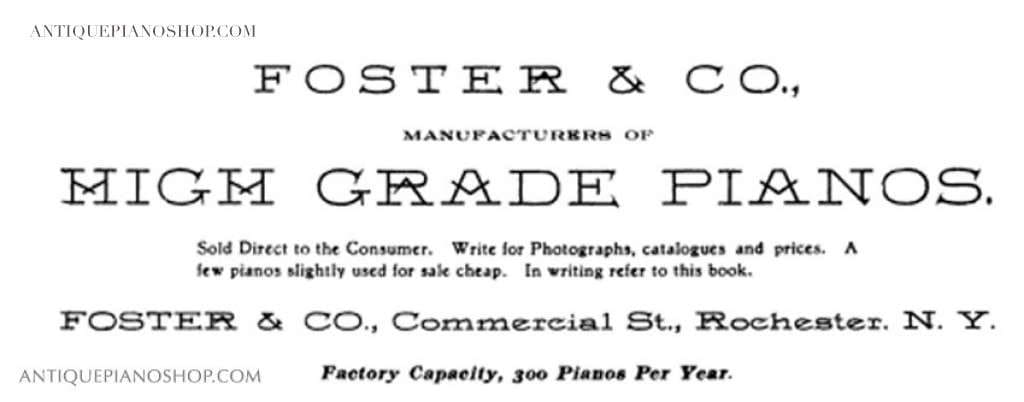 The Foster Piano Company was established in 1890 in New York City. Before the turn-of-the-century, Foster & Co. merged with the Armstrong Piano Company to form the Foster-Armstrong Piano Company. Foster-Armstrong was a major force in piano manufacturing in the early 20th Century, and they built pianos under the names of Foster, Armstrong, and Foster-Armstrong.