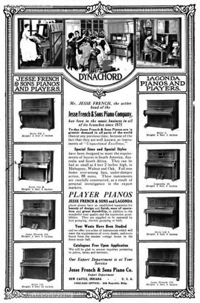 The Jesse French Piano Company of New Castle, Indiana was a major player in the piano industry during the 19th and 20th Centuries. Established in 1875, his pianos were first built in Nashville, Tennessee under the name of “Dorman, French & Smith”. Jesse French organized his own firm of “The Jesse French Piano & Organ Company” in 1885. In 1902, Jesse French went into partnership with Albert Krell of Ohio and the name of the firm was changed to “Krell-French“. Albert Krell left Krell-French in about 1905, and the firm became “Jesse French & Sons”. Jesse French continued to build pianos until his death in 1927.