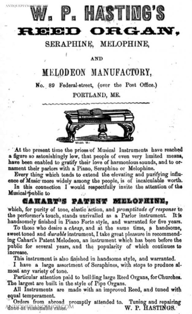 The firm of W. P. Hastings was active in piano, organ and melodeon manufacturing & retail during the mid to late 19th Century. Founded by W. P. Hastings in Portland, Maine, the firm built higher quality instruments on a very small scale compared to most other manufacturers. Their warerooms and manufactory was located at 89 Federal Street, and they offered instruments by several other makers in addition to their own “W. P. Hastings” brand instruments. Very little information is listed about this firm in our archives, but it does appear that they were out of business well before the turn of the 20th Century. Surviving instruments by Hastings are of consistently good quality.