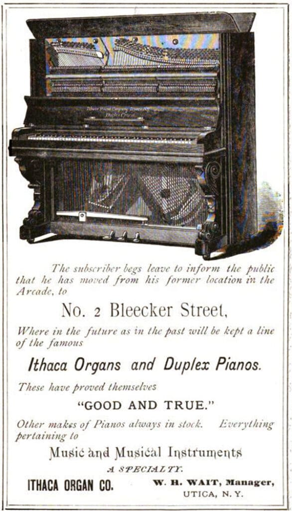 The Ithaca Piano & Organ Company was established in 1877 by William Bostwick and Henry Wegman as successors to The Swiss Organ Company. The firm was first listed as the “Ithaca Organ Company” and was a division of the “Ithaca Calendar Clock Company”, makers of clocks and other small mechanical devices. Alonzo Cornell, son of Ezra Cornell (founder of Cornell University) was principal financial backer of the firm.