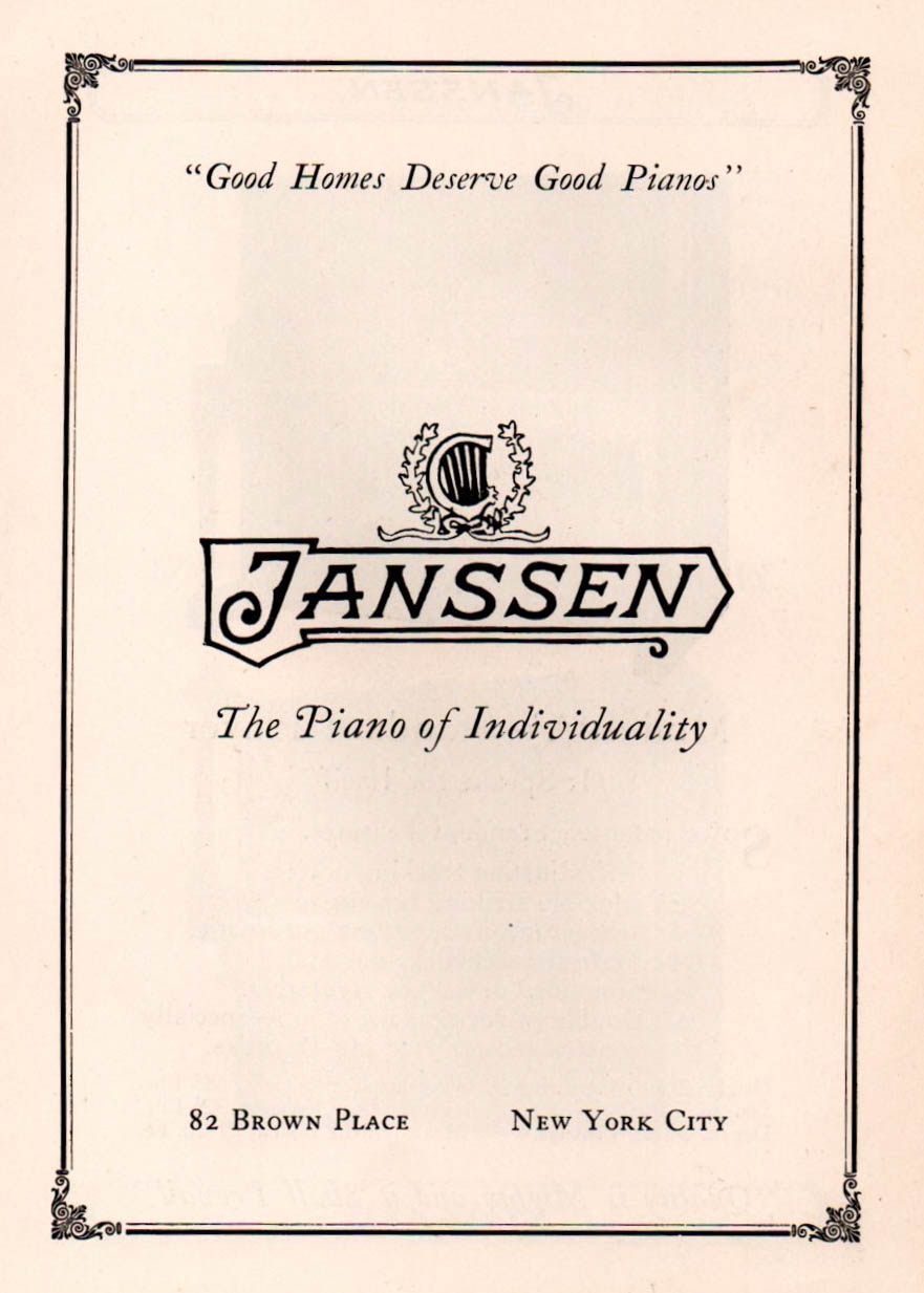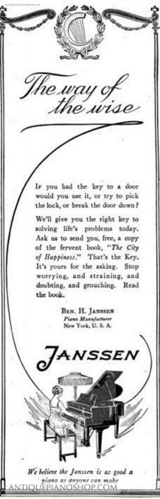 The Janssen Piano Company was established in 1901, and their factory was located at 82 Brown Place, New York City. Janssen was a larger manufacturer during the early 20th Century, and they offered a full line of upright pianos, baby grand pianos and player pianos. Janssen manufactured pianos for several popular American piano companies, including R.S. Howard, Raymond, and Wissner.