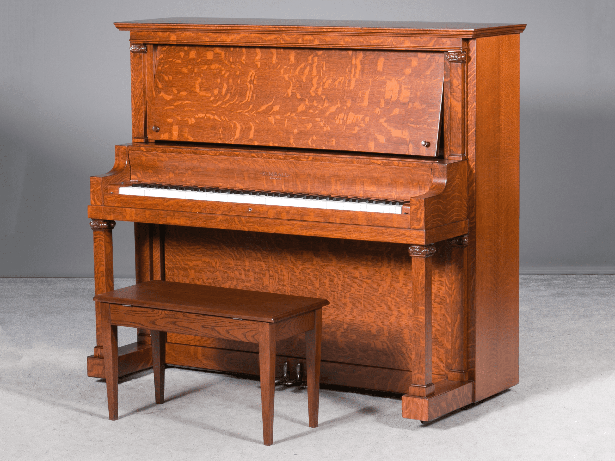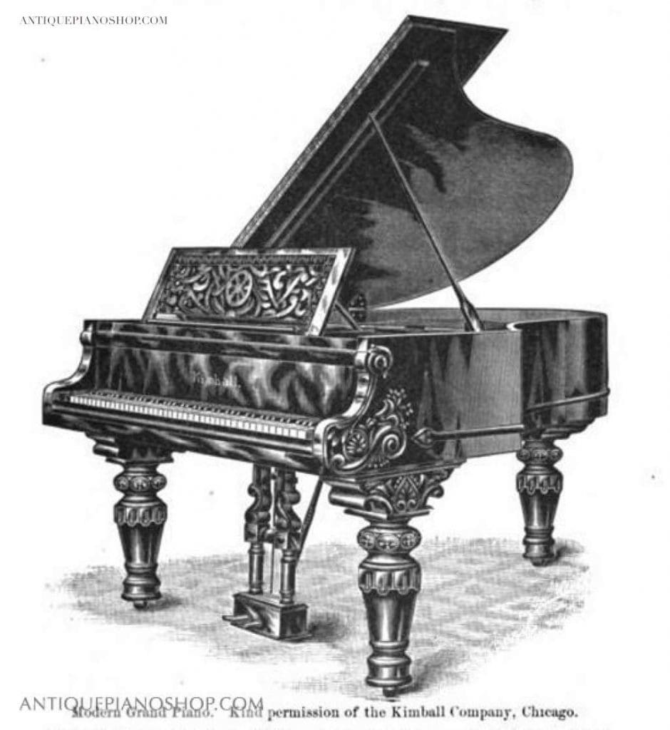 We see quite a few antique Kimball pianos come through our restoration shop. One might assume that since Kimball was built in large numbers and sold at an affordable price that Kimball pianos must be mediocre at best. However, our experience has been that pre-depression era Kimball pianos are exceptionally well made, good sounding instruments. A typical Kimball turn-of-the-century upright piano has longer strings and a larger soundboard than most upright pianos, and the tone quality (especially in the bass) can be exceptional in a restored antique Kimball piano.
