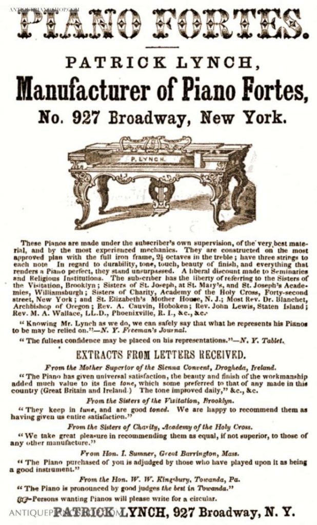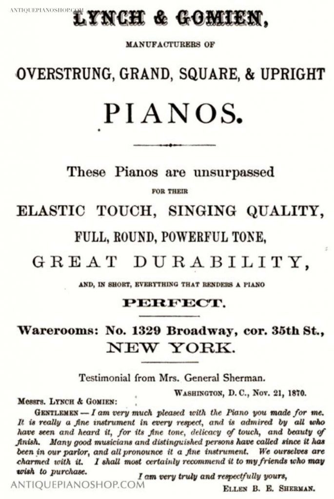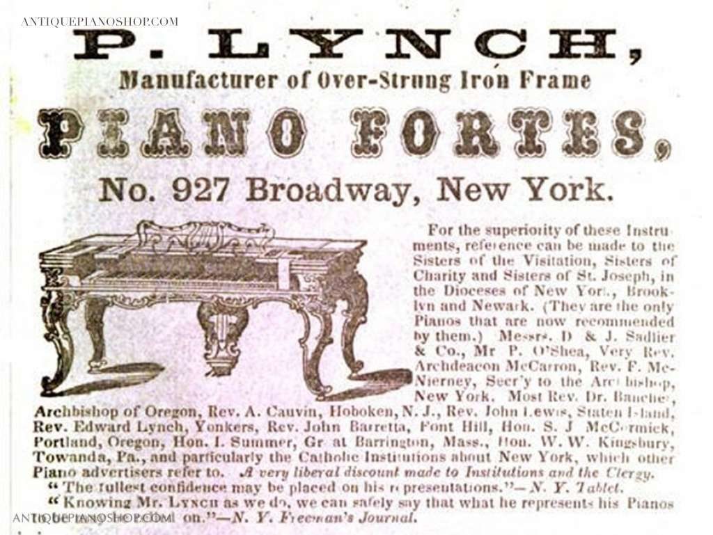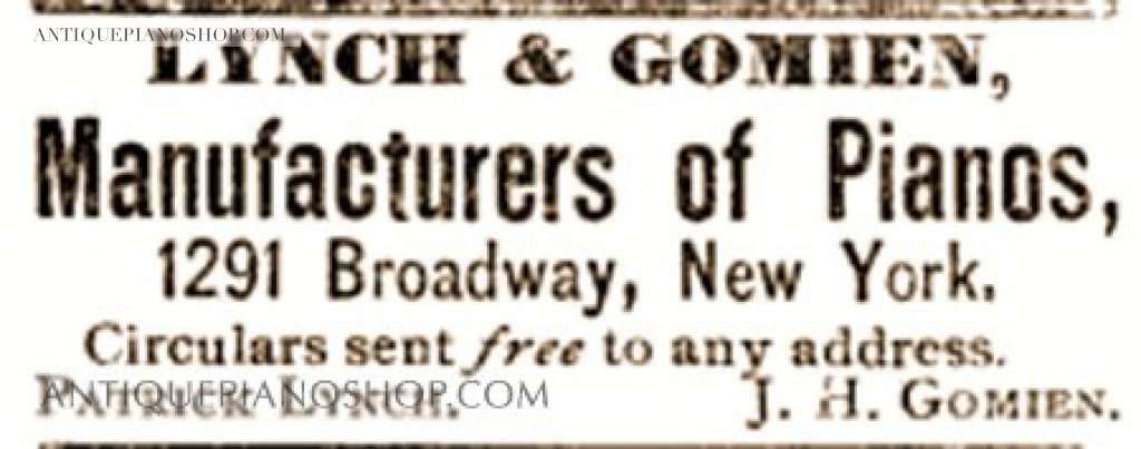 The P. Lynch Piano Company was established in New York City in 1853 by Patrick Lynch. At first, Lynch is listed as being a retailer of pianos and musical instruments, but he was manufacturing square grand pianos by about 1860. Lynch marketed his instruments strongly throughout the Catholic community by advertising in their periodicals and offering references of seminaries, clergy, and convents. In 1866, Lynch went into partnership with a gentleman by the name of Gomien, and they built pianos under the name of Lynch & Gomien until about 1880.