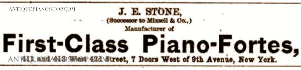 Peter Mixsell began his career working in a piano factory in Albany during the 1850s before moving to New York City in 1860 to join Aaron Mixsell in the firm “A & P Mixsell”. After the firm dissolved in 1861, Peter went into a brief partnership with a gentleman by the name of Flood to establish the firm of “Mixsell & Flood”. In about 1862 Peter Mixsell reestablished himself “Mixsell & Company” at 117 East 19th Street. In 1864, the firm was changed to “P. Mixsell & Company”, manufacturers of “Carpenter’s Patent Harmonium Grand Pianos”. These unique instruments were actually square grand pianos with a small harmonium (reed organ) built into one side of the case with its own separate keyboard. Although these instruments were widely advertised in their day, they are exceedingly rare today. Peter Mixsell retired in about 1872, and sold his factory to Mr. J. E. Stone.