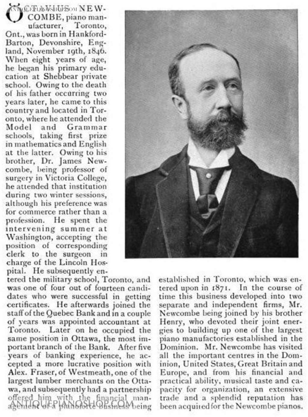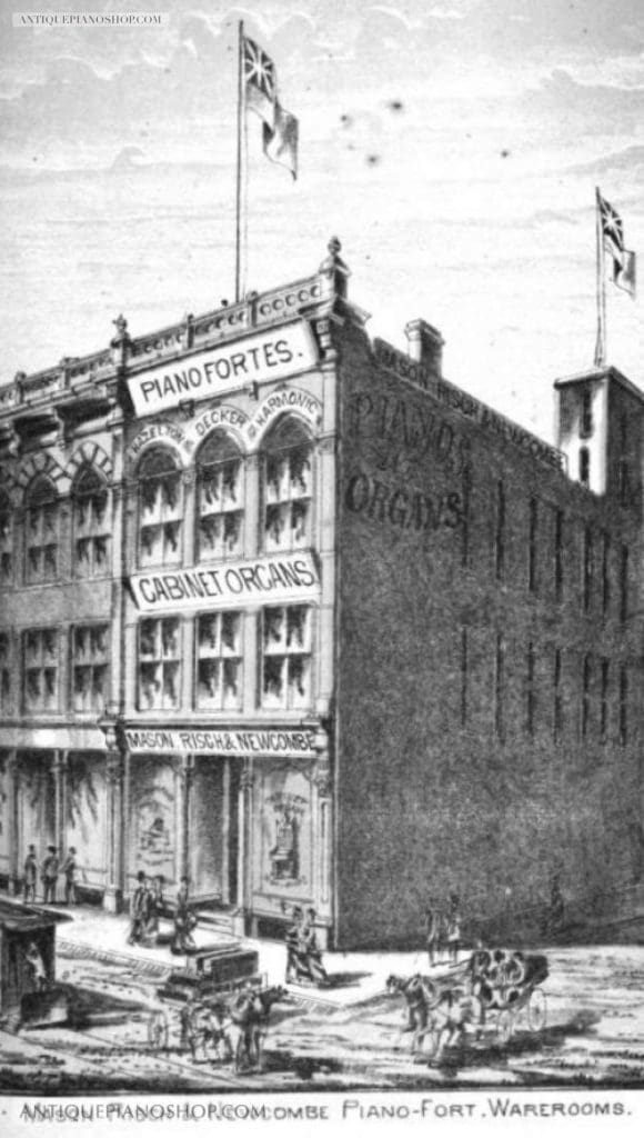 Octavius Newcombe was originally a partner in The Mason & Risch Piano Company of Toronto. Mason & Risch was established in 1871 with the partnership of Newcombe with Thomas G. Mason and Vincent Rich. For a brief period during the late 19th Century, instruments were produced under the “Mason, Risch & Newcombe” brand name. Newcombe left the firm in 1877 to build pianos and organs under his own name.