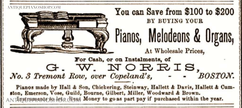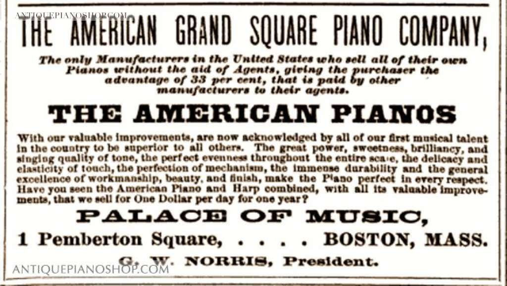 Around 1870 G. W. Norris took his sons Lucian W. Norris and Alvah M. Norris into partnership and formed the firm ‘The American Grand Square Piano Company‘. The firm was located at #1 Pemberton Square, Boston, with G. W. Norris at President. The American Grand Square Piano Company sold their instruments directly to the public through mail order and catalogs, eliminating the needs for retail ‘middlemen’. Their claim was that they could save the buyer up to 30% retail by offering pianos directly from the manufacturer. The firm enjoyed great success, and their pianos were known to be durable and of very good quality at an affordable price. G. W. Norris remained President of the firm until his death in 1887.