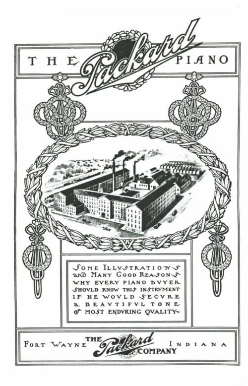 Isaac Packard originally established his firm as “The Packard Organ Company” in 1871 in Fort Wayne, Indiana. Packard only built organs until 1893, incorporating pianos into their line in about 1894 and changing the name of the company to “The Packard Piano & Organ Company”. Packard started out offering upright and baby grand pianos, adding player pianos in the first decade of the twentieth century.
