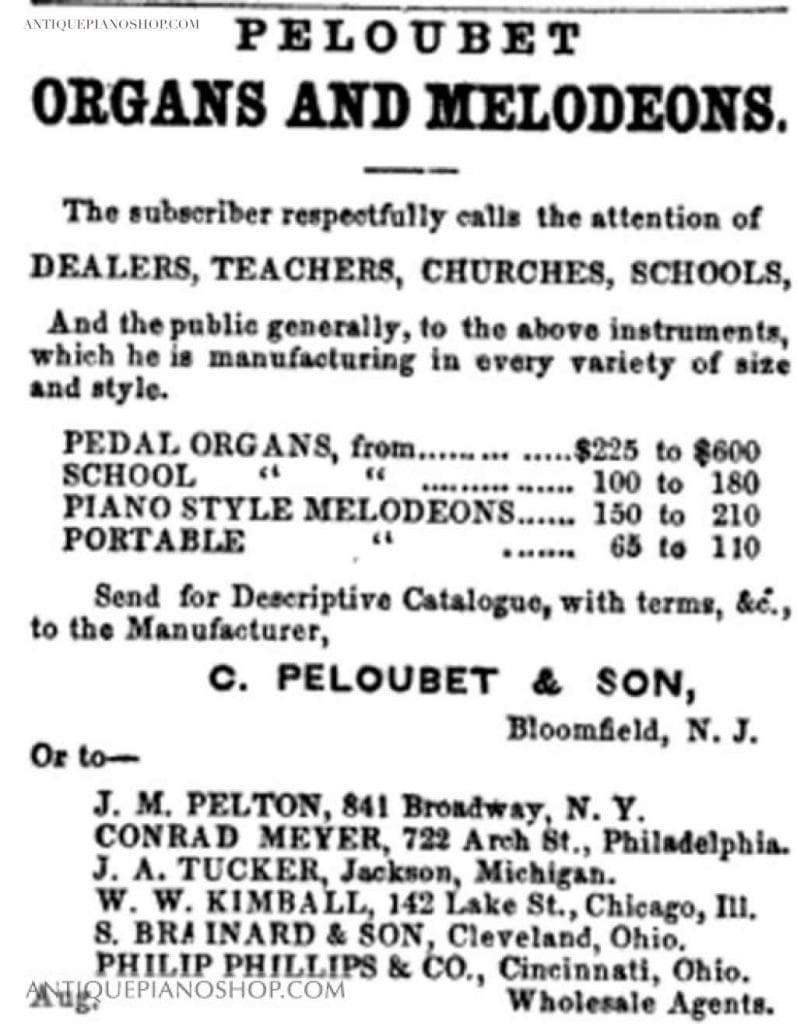 In 1873 J. M. Pelton was admitted into partnership, and the firm was then called “Peloubet, Pelton & Company’”. Shortly thereafter, the firm’s name was again changed to “Peloubet & Pelton Standard Organ Company”. J. M. Pelton left the firm in about 1882 and Peloubet continued several operations as “Peloubet Standard Organ Company” as well as “Peloubet Columbian Organ Company” and “Peloubet & Sons”. By this time, their offices were located at 841 Broadway, New York City. Chabrier Peloubet died in 1885 and his son Jarvis continued operations. In 1888 the firm introduced the “Reed Pipe Top Organ”. Jarvis Peloubet sold the company to Lyon & Healy of Chicago in 1890.