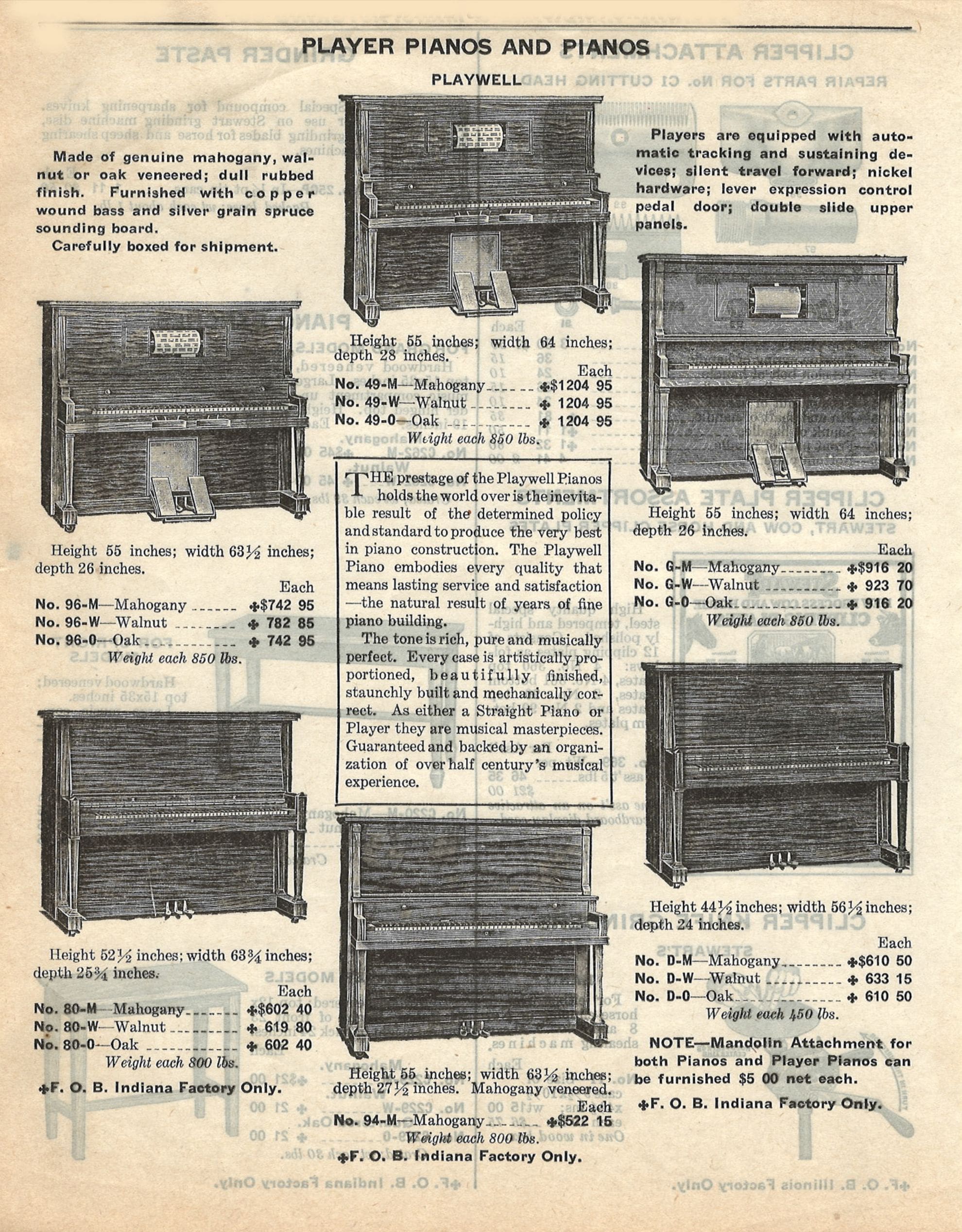 The “Playwell” brand name was sold by the Belknap Hardware & Manufacturing Company of Louisville, KY. Playwell pianos were actually manufactured by The Starr Piano Company of Richmond, Indiana and sold under the “Playwell” name under special contract with Belknap Hardware. Playwell pianos were widely sold in Belknap Hardware stores and in their extensive mail-order catalogs. “Playwell” pianos are essentially Starr brand pianos, and these instruments are generally of very good quality.