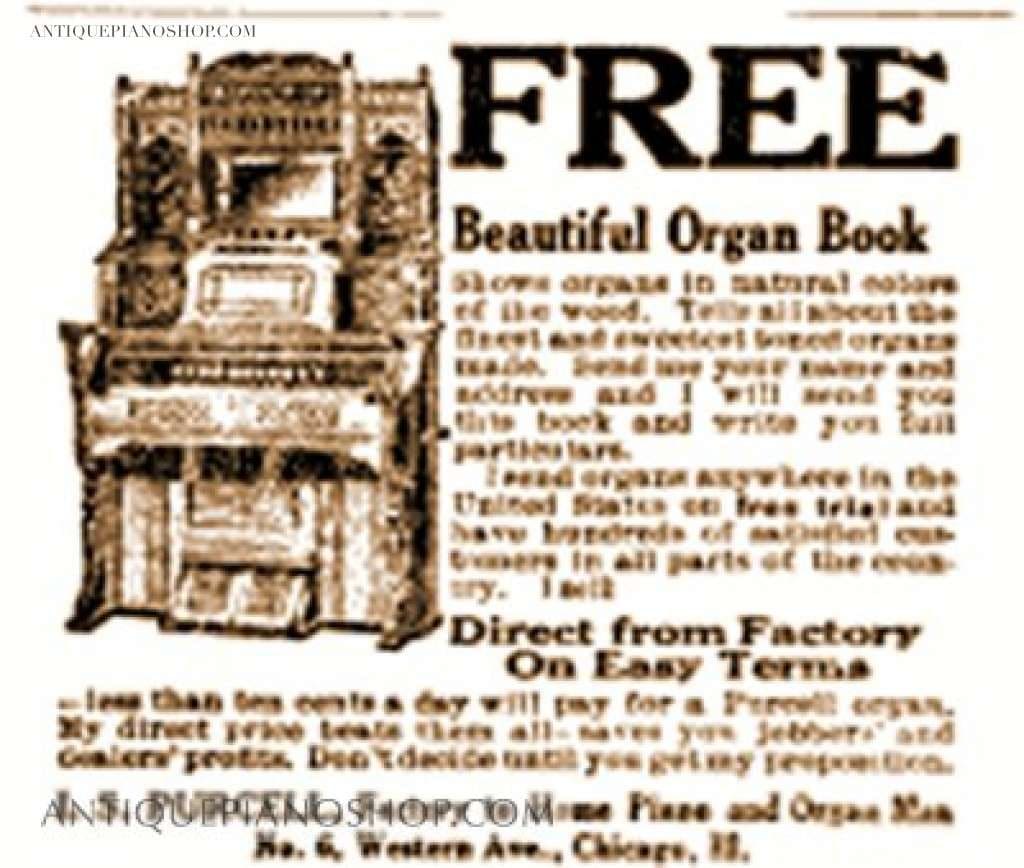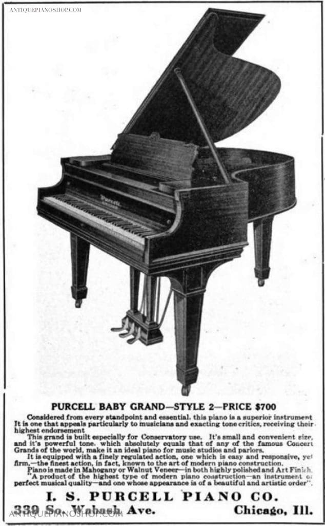 I. S. Purcell was born in Missouri in 1869. By 1890, Purcell was building pianos and organs under his own name in Chicago. Purcell’s big break came when he partnered up with W.W. Kimball of the famous Kimball Piano & Organ Company, building pianos that were retailed by Kimball’s large piano retail outlets. Purcell built pianos and organs during the late 19th Century, but discontinued organs by 1910 and increased production in pianos. During the ‘teens’ and ‘twenties’, I. S. Purcell offered a full line of upright pianos, player pianos, and grand pianos that were sold along side Kimball and other famous brand names. Instruments by Purcell were known to be of very good quality while at the same time being an affordable alternative to costlier brand name pianos. I. S. Purcell went out of business in about 1929 due to the Great Depression.