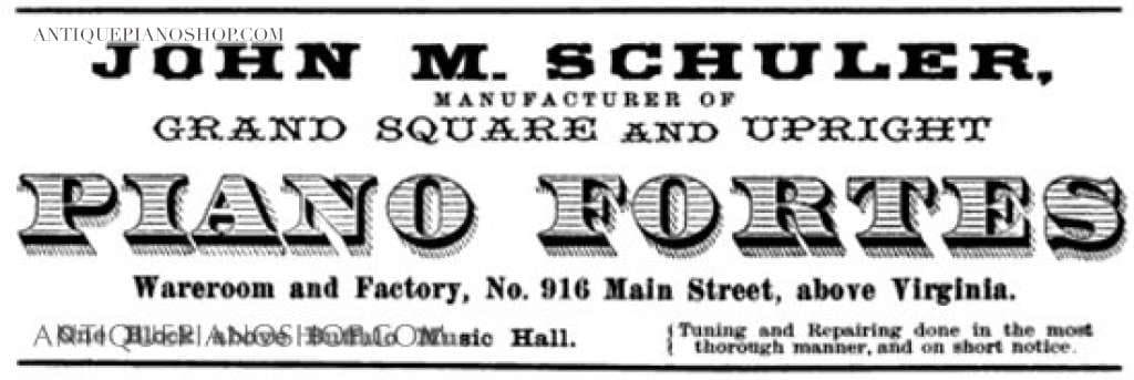 Charles Frederick Schuler was a small-scale piano builder in New York City during the latter half of the 19th Century. It appears that Schuler began his career sometime around 1860, and is listed at 178 Prince Street in 1866. In 1869, Schuler went into partnership with Ferdinand Ludke, establishing the firm of “Ludke & Schuler”. This partnership was short lived and was dissolved in 1870. Pianos built by Schuler were known for being of very good quality, “possessing a superior tone” according to their maker. Schuler enjoyed moderate success during the 1870s, and added organs to his product line in about 1885.