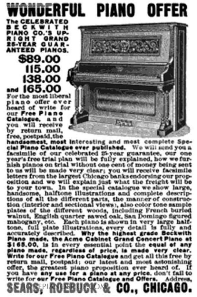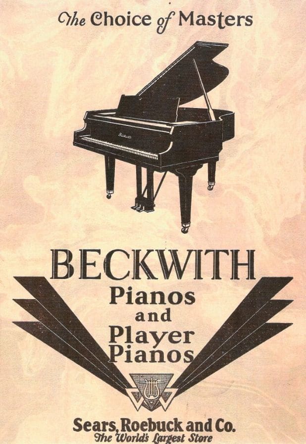 For decades, Sears Roebuck & Company built and sold pianos & organs under the names of American Home, Sears Roebuck & Co., Beckwith, Maywood, Beverley, and Caldwell. These pianos were of very good quality, yet they were made affordable by payment plans, financing, etc. Because of high quality, brilliant marketing and widespread distribution of their sales catalogs, Sears Roebuck products became a household name then as they are today.