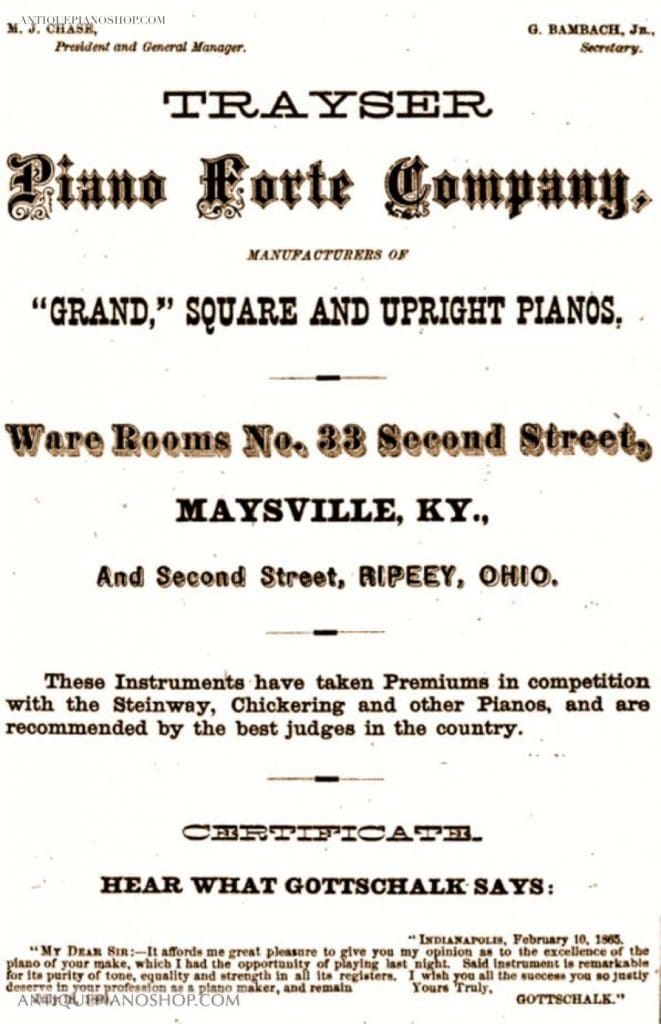 In 1853, Trayser’s younger brother, Phillip Trayser (who lived in Baltimore) signed a guarantee for $1,000 for Trayser to expand his business. In 1854 George L. Trayser entered into a brief partnership with John A. Skiff in the firm of “Skiff & Trayser Piano Company”. Skiff marketed and sold Trayser’s pianos around the region with some success. Unfortunately, George L. Trayser struggled financially and was insolvent before 1855. In 1857, the Covington KY factory was destroyed by fire. George L. Trayser then moved his factory to Louisville, Kentucky.