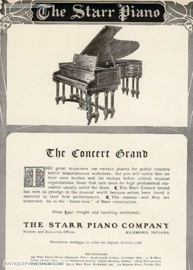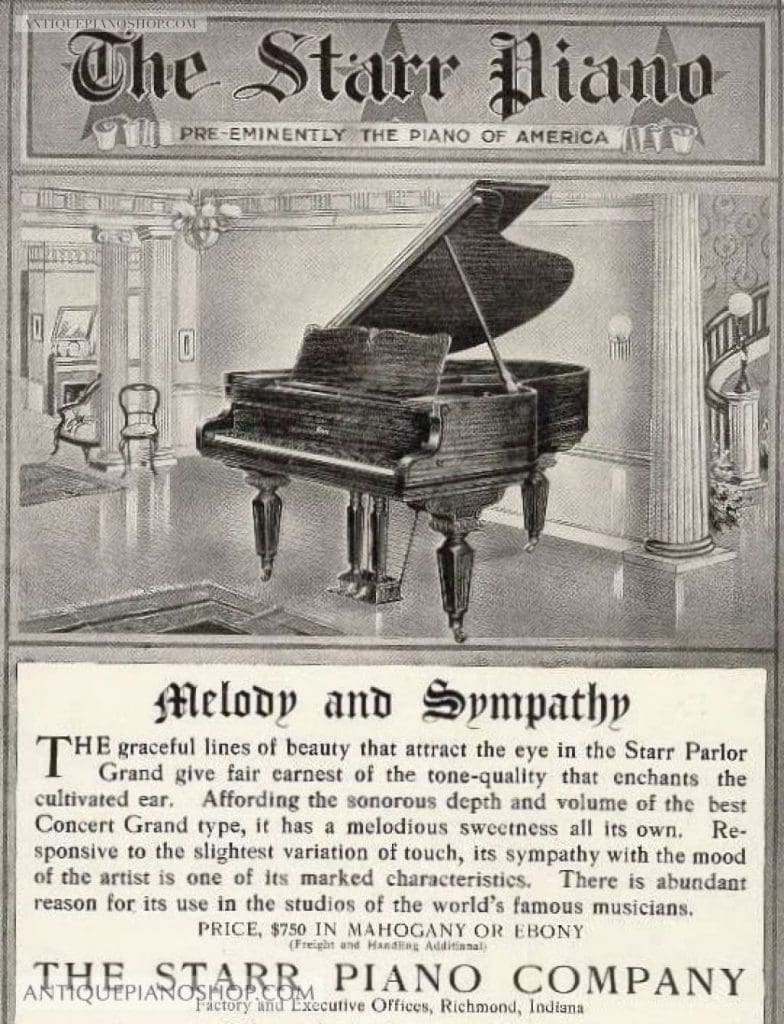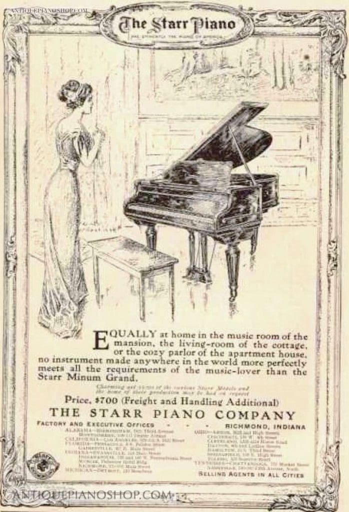 The Illustrious Starr Piano Company has its roots going as back as 1863 when George L. Trayser began building pianos in Ripley, Ohio. In 1869, his firm was incorporated as “The Ohio Valley Piano-Forte Company”. The Ohio Valley Piano-Forte Company built pianos under the names of “Valley Gem” for D. H. Baldwin. In 1872, George L. Trayser moved to Richmond, Indiana to form “The Trayser Piano Company”.
