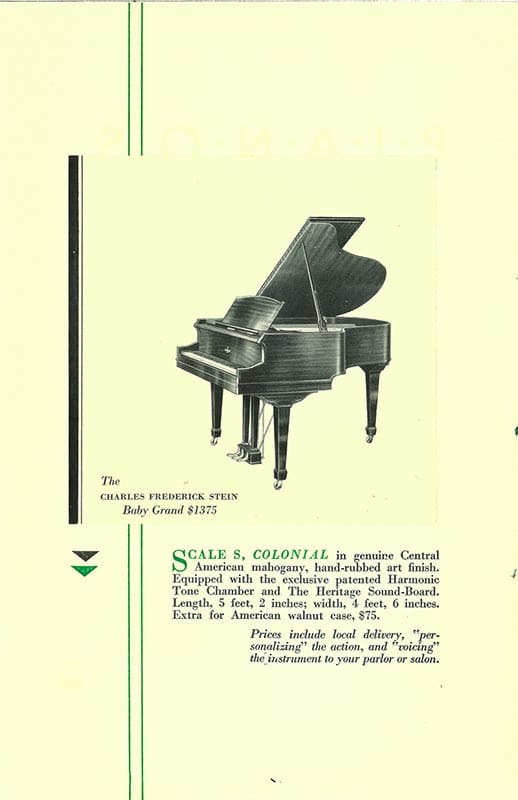 At first the firm built only grand pianos and grand player pianos, but later introduced upright and studio pianos to their line in 1931. One of Charles Frederick Stein’s more memorable inventions was a “tone chamber” located between the strings and soundboard, patented in 1934.