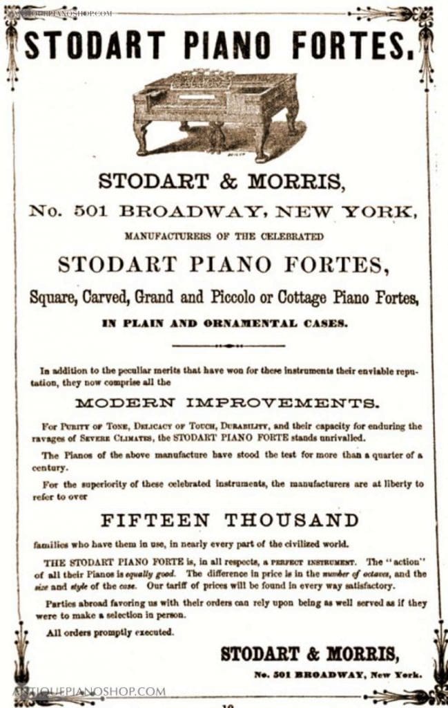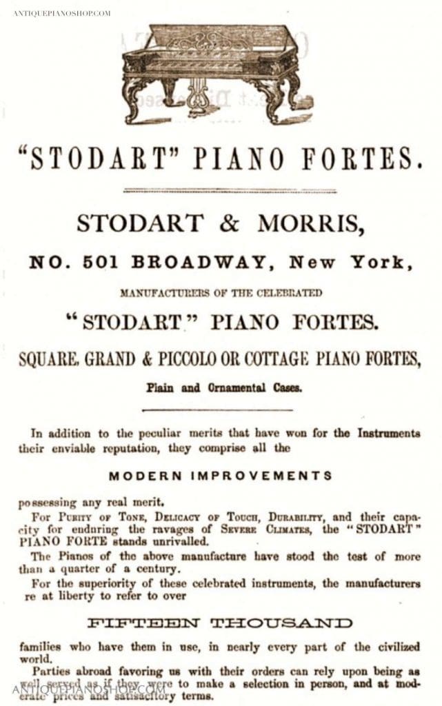 Stodart & Morris: In 1856, Adam Stodart went into partnership with Charles M. Morris, forming the firm of “Stodart & Morris”. Stodart & Morris continued to build well-made instruments, primarily square grand pianos. Adam Stodart retired in about 1870 at which time Morris took full control.