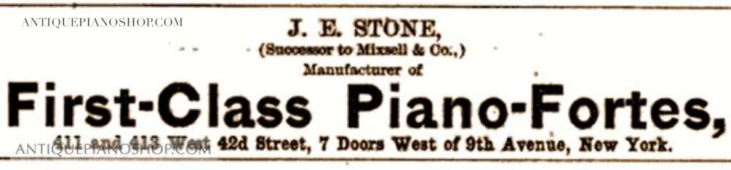 Mr. J. E. Stone purchased the illustrious firm of Mixsell & Company of New York City in 1872. Members of the Mixsell family were very active in piano & organ building during the 19th Century. These family members include Aaron Mixsell, Peter Mixsell, Philip Mixsell, and Isaac Mixsell.