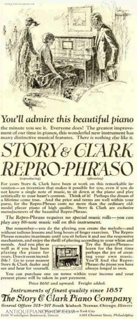 Story & Clark is one of the few American piano manufacturers to survive both The Great Depression and World War II without being absorbed into a larger conglomerate. In 1962, Story & Clark was purchased by the Lowery Organ Company. The firm built pianos under both the “Story & Clark” and “Lowery” brand names. The Story & Clark name was purchased by The Classic Player Piano Company in 1991, then was purchase by QRS Music, Inc., in 1993. QRS Music is still producing pianos under the Story & Clark brand name today.