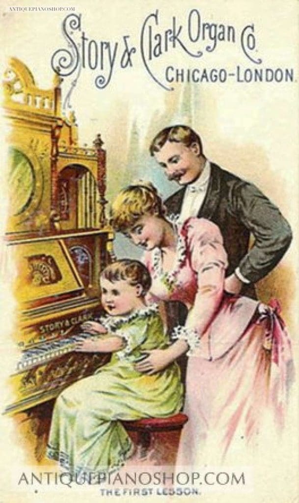 The Story & Clark Piano & Organ Company is one of the most popular piano manufacturers in America. Hampton L. Story opened his first music store in Burlington, Vermont in 1859. In 1862 Story went into partnership with a piano builder by the name of Powers and formed “The Story & Powers Company”. Story & Powers was the first piano manufactory in the state of Vermont. In 1867 Jacob Estey of the famous Estey Organ Company offered H. L. Story the Estey Organ Agency for the Midwestern United State, so H. L. Story left his business in Vermont and relocated to Chicago.