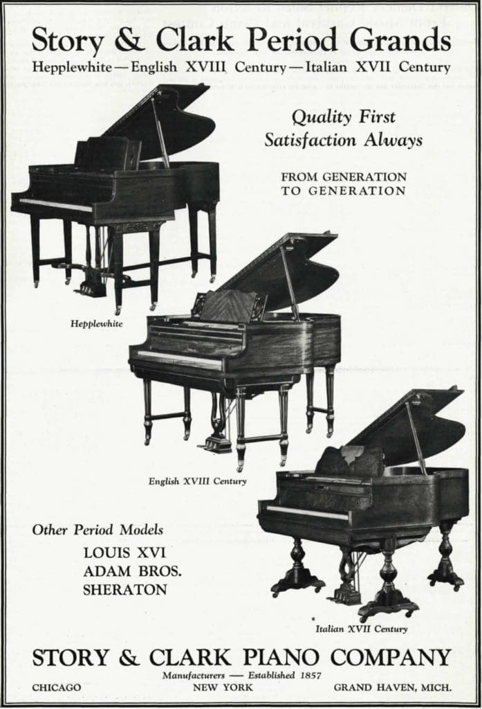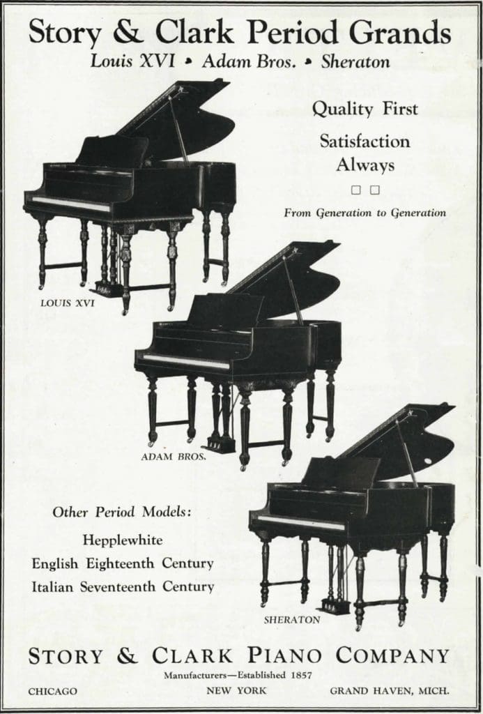 Melville Clark withdrew from Story & Clark in 1900 in order to concentrate on building player pianos under his own name, yet the firm continued to operate under the “Story & Clark” name after Clark’s departure. By this time Story & Clark was building several lines of very well made upright pianos. Because of their huge success, the firm was able to build a second factory in Grand Haven, Michigan in 1901 in order to fill demand for their pianos. This second factory allowed Story & Clark to add several lines of player pianos and baby grand pianos to their product line throughout the ‘teens and ‘twenties.