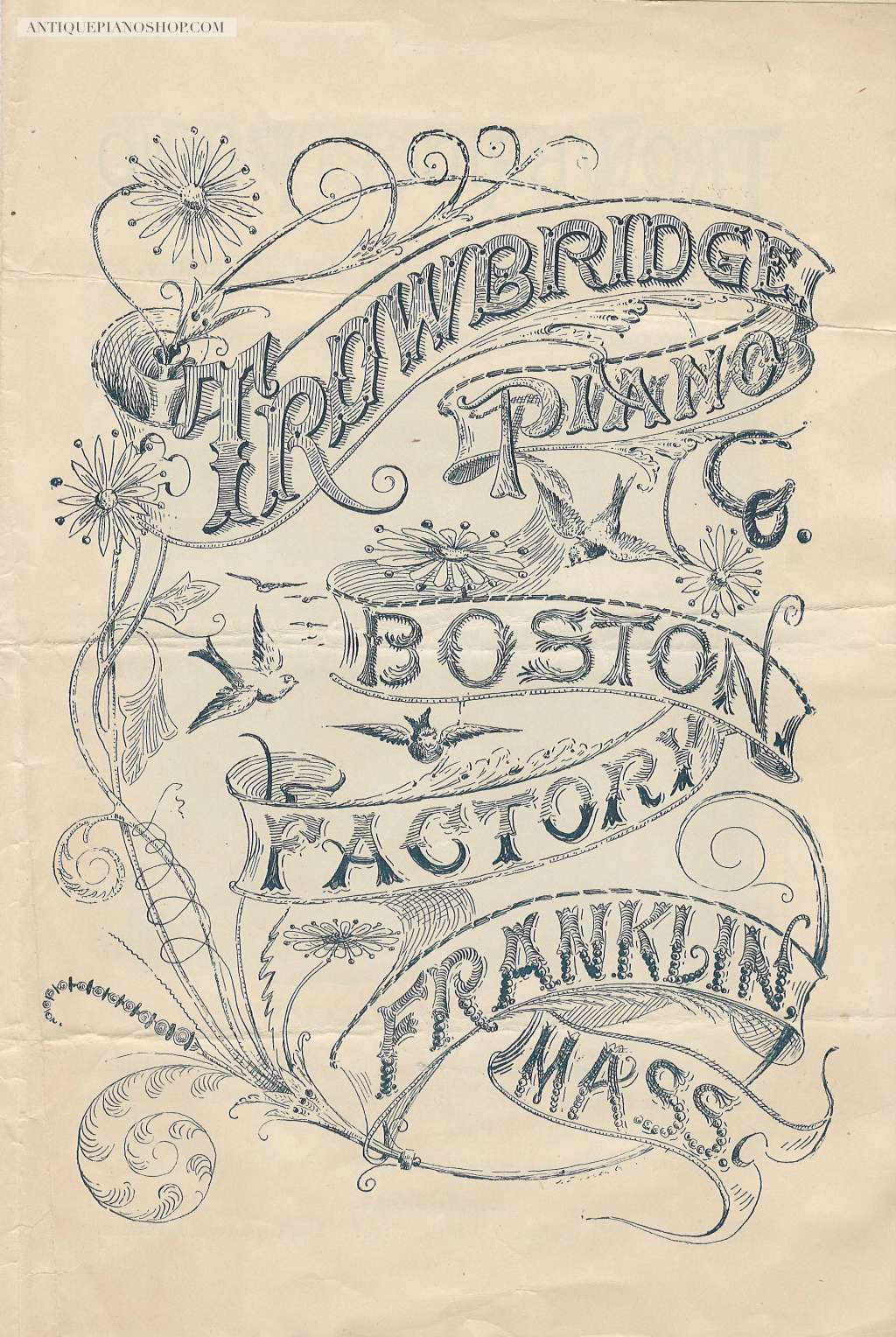 Mr. F. A. Trowbridge established “The Trowbridge Piano Company” in 1888 in Franklin, Massachusetts. The Trowbridge Piano Company was a very small, family-owned firm that specialized in building several lines of good-quality upright pianos. The firm experienced a good reputation and modest success. In addition to “Trowbridge” pianos, the firm built pianos under the “Edward” and “Florence” brand names.