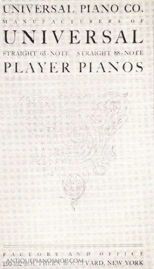 The Universal Piano Company of New York (not to be confused with the Universal Player Piano Company of California from the 1980’s) was established in 1908. The firm was organized by Isadore Goldman, President, A. B. Furlong, Jr., Vice President, Louis Goldman, Treasurer and Manager, and Samuel Goldman, Secretary. The Universal Piano Company produced player pianos exclusively under the “Universal” brand name. The Universal Player Piano Company began having financial difficulties during World War I and was closed in 1914.