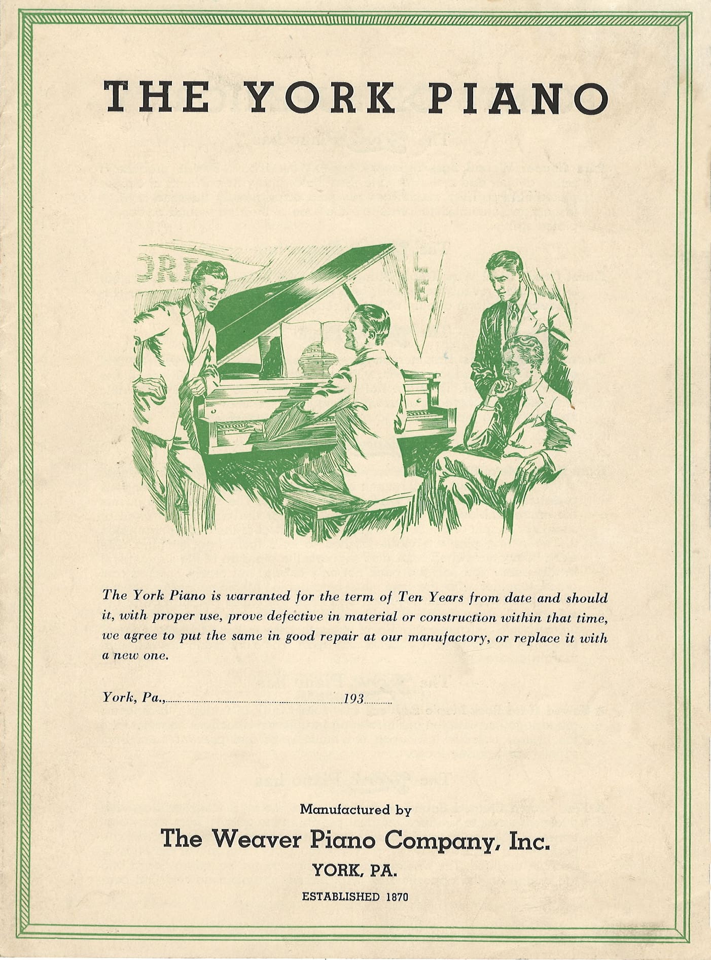 The Weaver Piano Company offered a full line of upright pianos, player pianos and grand pianos. The firm built several popular brand names including Livingston, York, Lincoln, and Davis & Sons. Weaver also controlled the “Oriole Piano Company” of Baltimore, MD. After the Great Depression era, Weaver built a line of spinet, console and baby grand pianos that remained popular for several decades.