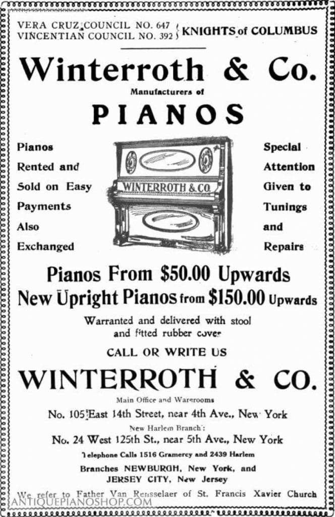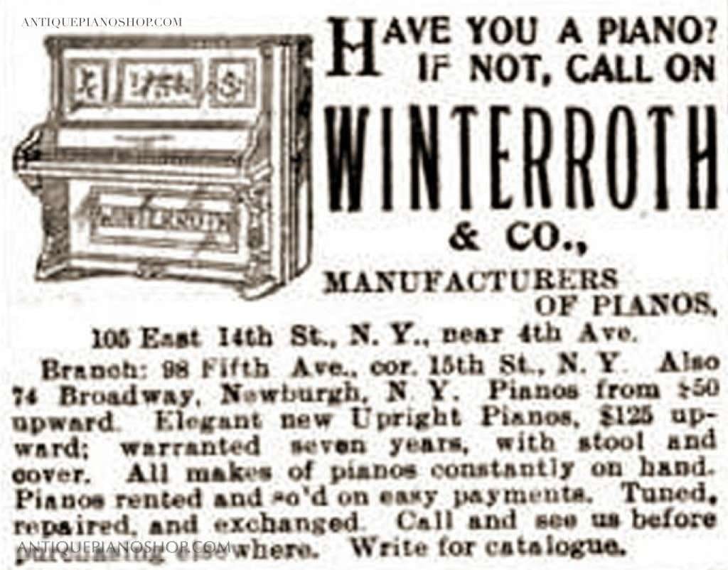 Winterroth & Company was established in 1885. Their factory was located at 105 East 14th Street, New York City. The firm was known for building good quality pianos at affordable prices, and they were modestly successful. After the turn-of-the-century, Winterroth integrated a line of player pianos, increasing their success during the ‘teens and ‘twenties. Like so many other American piano manufacturers, Winterroth & Company went out of business by 1930 due to the Great Depression.