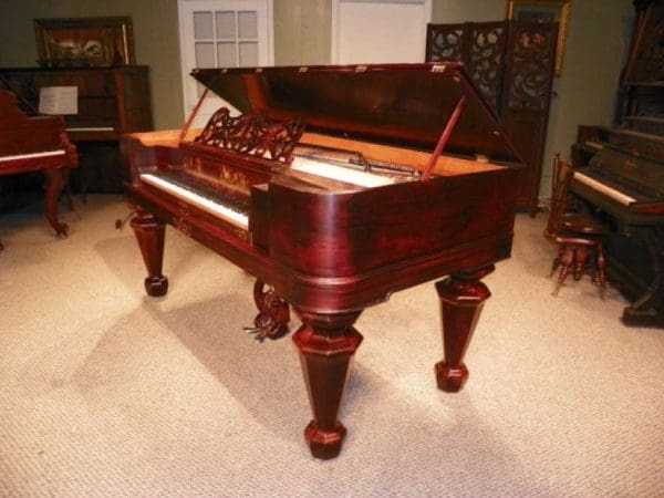 This lovely piano was built by A. H. Gale in 1851, a little over a decade before the Civil War. It is made of stunning Brazilian Rosewood and is of the classic Empire Revival Style with large, heavy legs and ornately carved pedals and music rack. Note the beautiful Mother-of-Pearl inlay across the name board – these pianos with Mother-of-Pearl inlay were some of the most expensive pianos money could buy in 1851. This piano has been restored to like new condition inside and out, and has a lovely harp-like tone quality that makes these square pianos so desirable for early music lovers. An original matching stool is included. Computerized player mechanisms can be installed if desired.